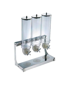 Fabricado en acero inoxidable y cilindros de polipropileno transparente, capacidad del cilindro de 3 x 4 litros.,Llave de dosificadora de cereal.,Medidas: 50 x 24 x 65 cm.