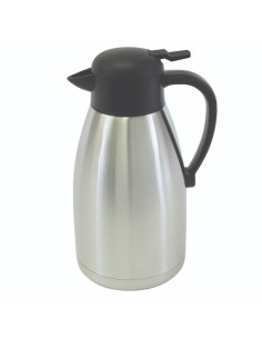 Jarra cafetera de acero inoxidable 18/8 con tapa y agarradera de polipropileno. Su capacidad es de 64 oz o aproximadamente 1.9 litros. Sirva café y agua caliente en eventos con la ayuda de una jarra térmica de acero inoxidable. Esta garrafa de 2 litros de capacidad mantendrá los líquidos calientes por mayor tiempo. Mantiene la temperatura del líquido caliente hasta por 6 horas.,Tapa de botón rojo que previene derrames y la fuga del calor.