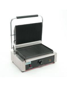 Con gabinete en acero inoxidable, plancha superior e inferior acanaladas con teflón. Potencia de 2 KW a 120 V. Termostato de 50 a 300 °C con luz indicadora y recolector de grasa.,Mide 43 x 30 x 20 cm